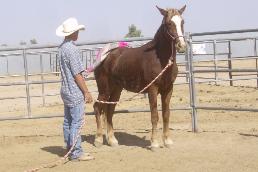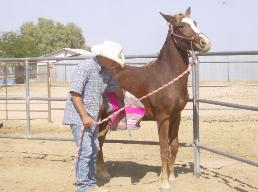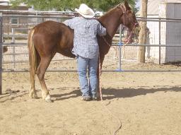 | During Flash's first trip to the round pen he learned how to lounge, reverse, give "two eyes" and stated his desentizing. |