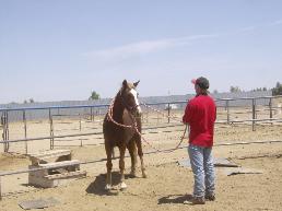 | Another day in the round pen. Flash now leads pretty good. Desensitinzing continues with scary stuff including Brandon. |